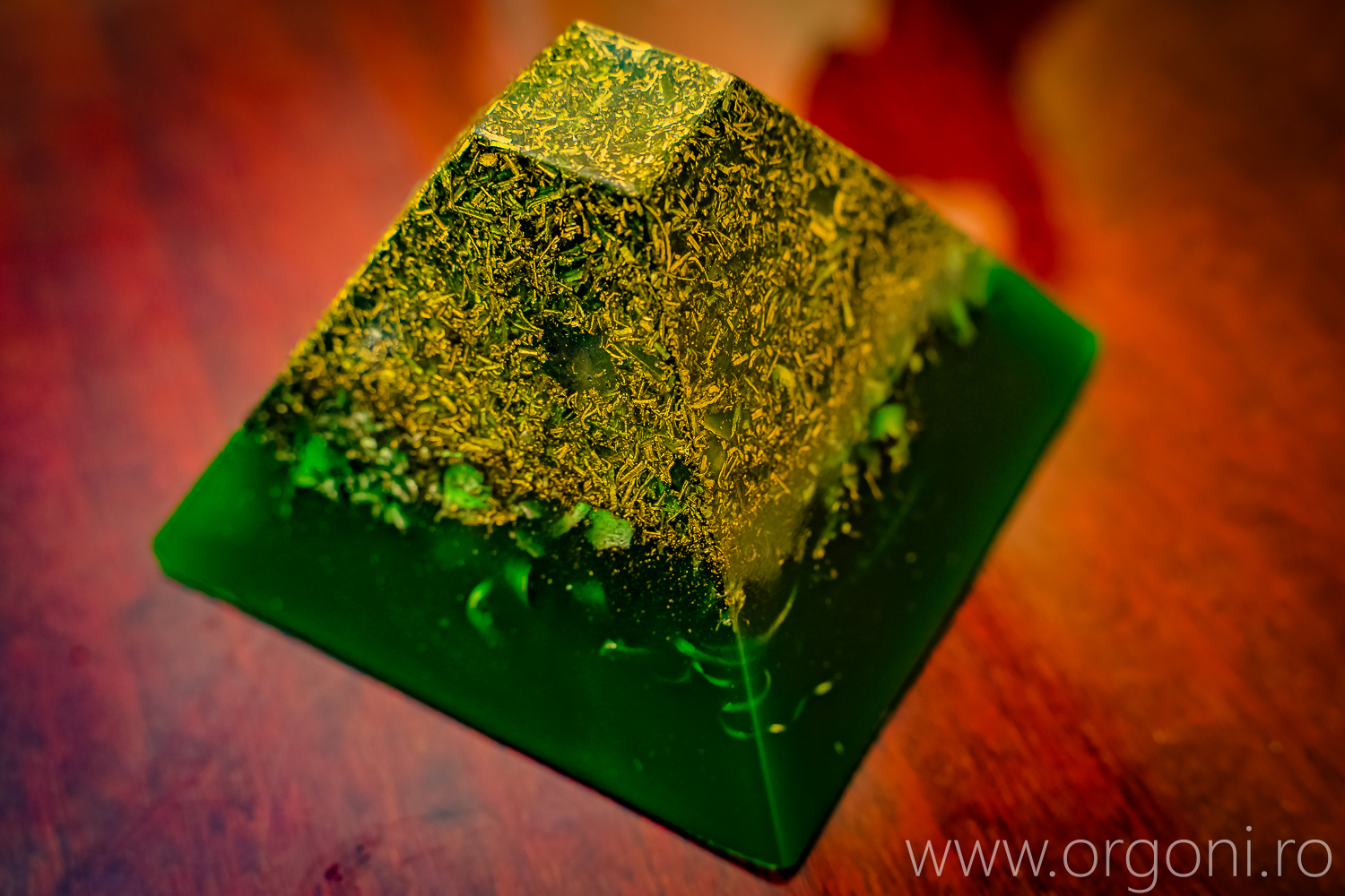 Forma si dimensiuni: Piramida orgonica verde cu diametrul bazelor de 92 mm (±10 mm) si inaltimea de 45 mm (±7 mm).